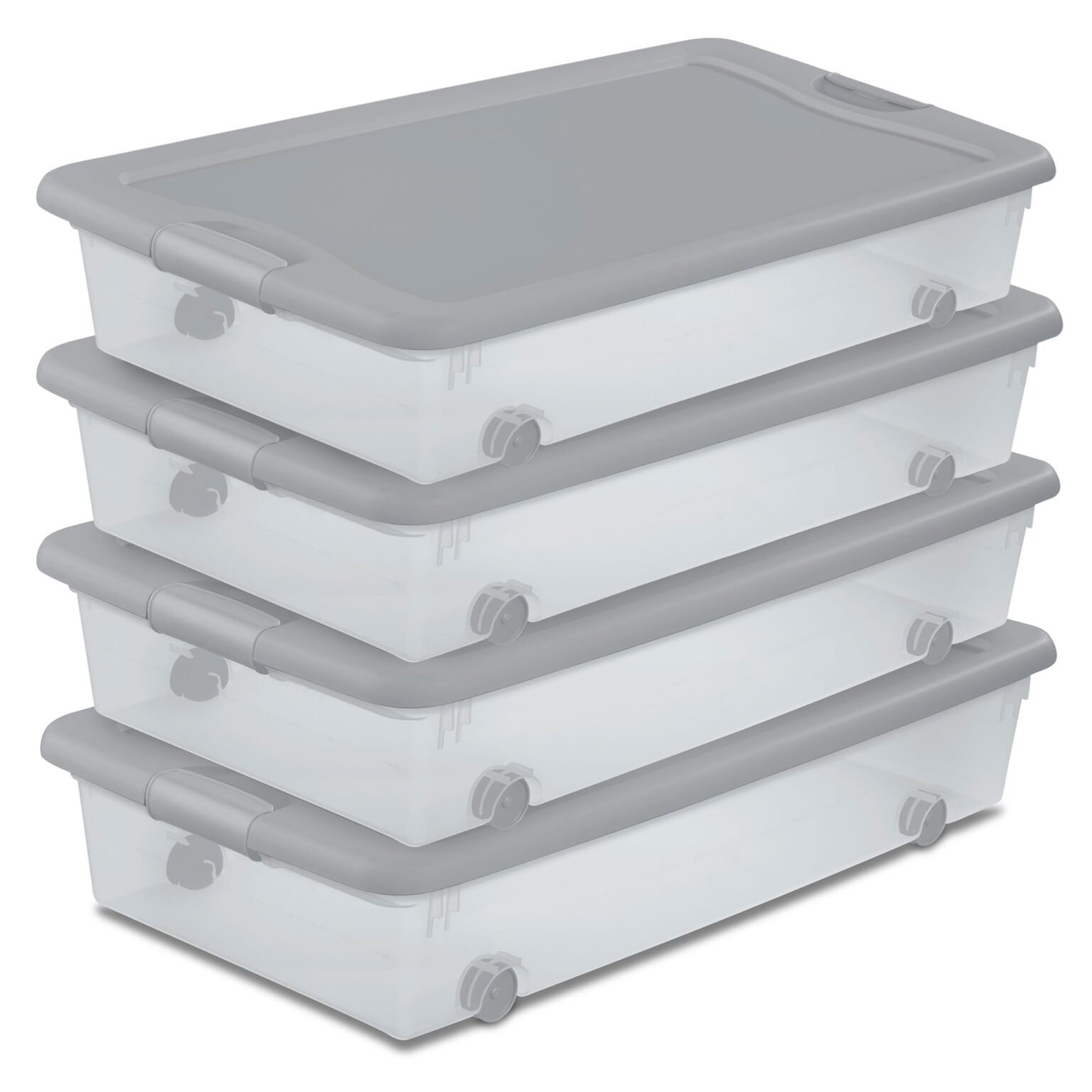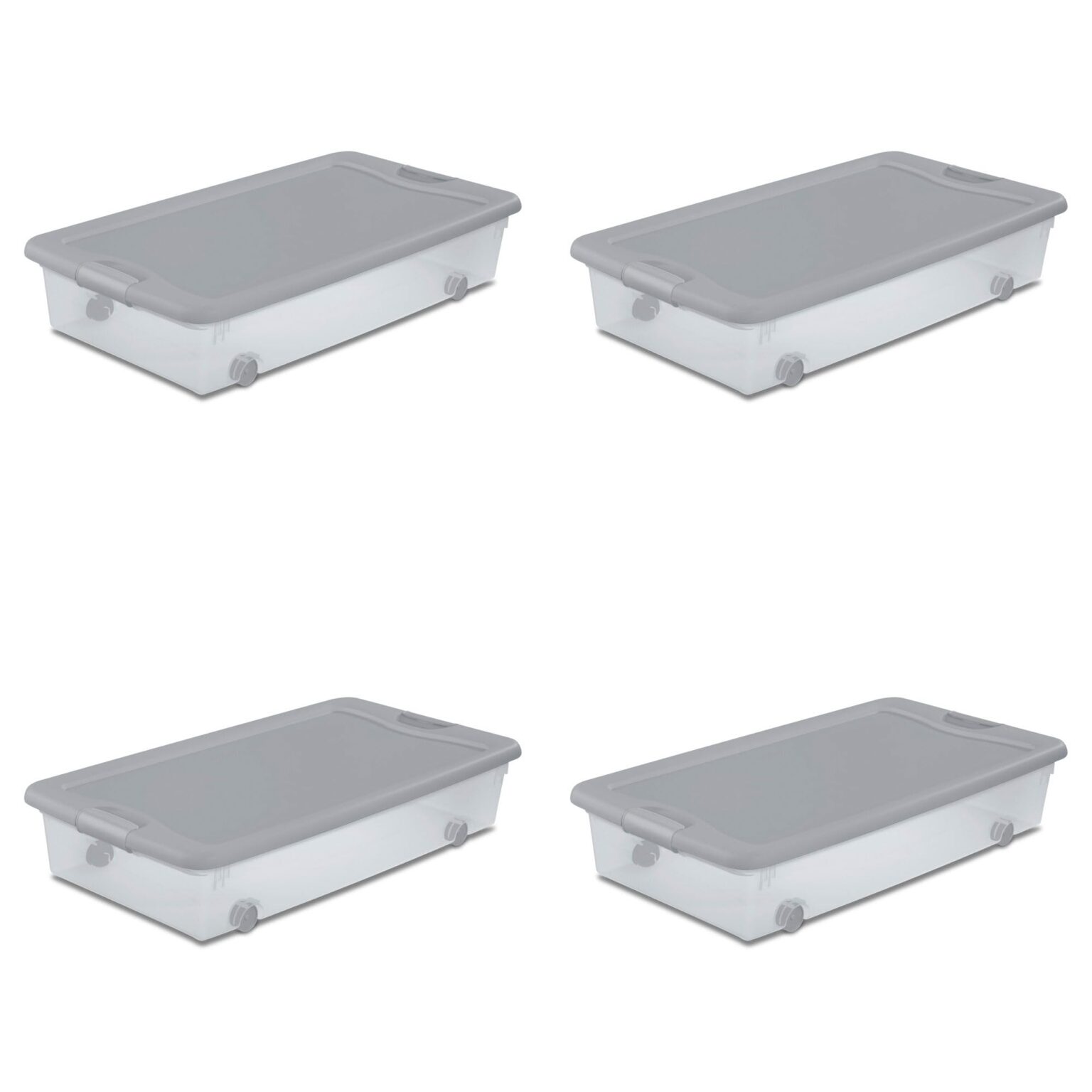 Sterilite 4-Pack 56 Quart Wheeled Latching Box, Underbed Plastic Storage Organizer, Silver – Under Bed Rolling Container Bin with Lid and Wheels for Home or Dorm Bedrooms and Closets