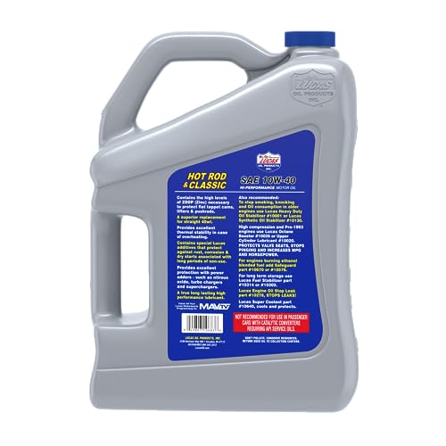 Details: This specially formulated oil is designed for muscle, showroom, classic, and trophy cars without catalytic converters. Lucas Oil Hot Rod & Classic Car 10W-40 Motor Oil provides maximum engine protection with rust and corrosion resistance, while improving performance, extending oil life, and reducing maintenance time with its cool and quiet operation. It improves oil pressure in worn engines for optimal engine performance and provides cool and quiet operation, ensuring a smooth and efficient driving experience. Extended drain intervals mean less frequent oil changes, saving your maintenance time