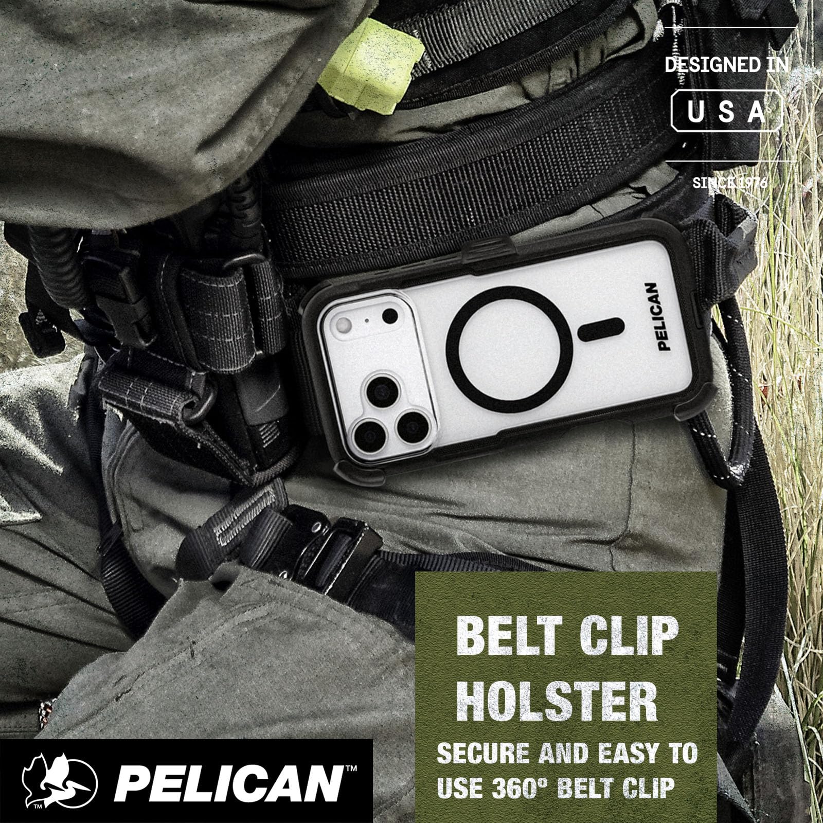 • Enhanced Functionality and Black/Clear Design: Protect your iPhone with the Pelican Voyager Series case; Featuring a clear back with black borders, this iPhone 17 Pro case includes a belt, holster stand, and clip, making it perfect for those who need more than just protection; The anti-scratch coating keeps your case looking newer for longer, while raised edges on both the front and back provide additional protection for your camera and screen