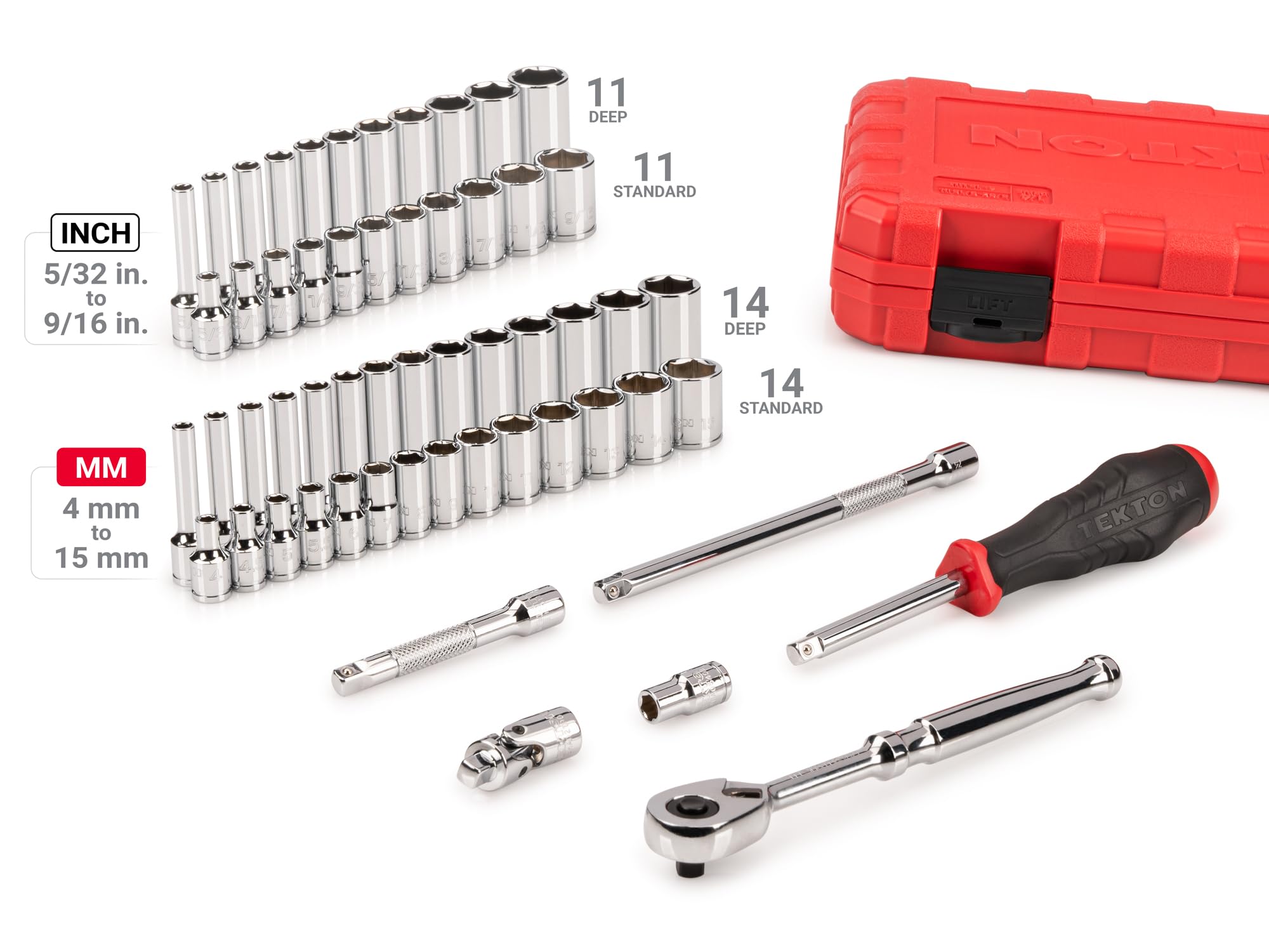 - Includes 11-pc. 1/4 in. drive 6-point sockets: 5/32, 3/16, 7/32, 1/4, 9/32, 5/16, 11/32, 3/8, 7/16, 1/2, 9/16 in.; 11-pc. 1/4 in. drive deep 6-point sockets: 5/32, 3/16, 7/32, 1/4, 9/32, 5/16, 11/32, 3/8, 7/16, 1/2, 9/16 in.; 14-pc. 1/4 in. drive 6-point sockets: 4, 4.5, 5, 5.5, 6, 7, 8, 9, 10, 11, 12, 13, 14, 15 mm; 14-pc. 1/4 in. drive deep 6-point sockets: 4, 4.5, 5, 5.5, 6, 7, 8, 9, 10, 11, 12, 13, 14, 15 mm; 1-pc. 1/4 in. drive universal joint; 2-pc. 1/4 in. drive extensions: 3, 6 in.; 1-pc. 1/4 in. magnetic hex bit holder; 1-pc. 1/4 in. drive high-torque spinner handle; 1-pc. 1/4 in. drive quick-release ratchet; Carrying case