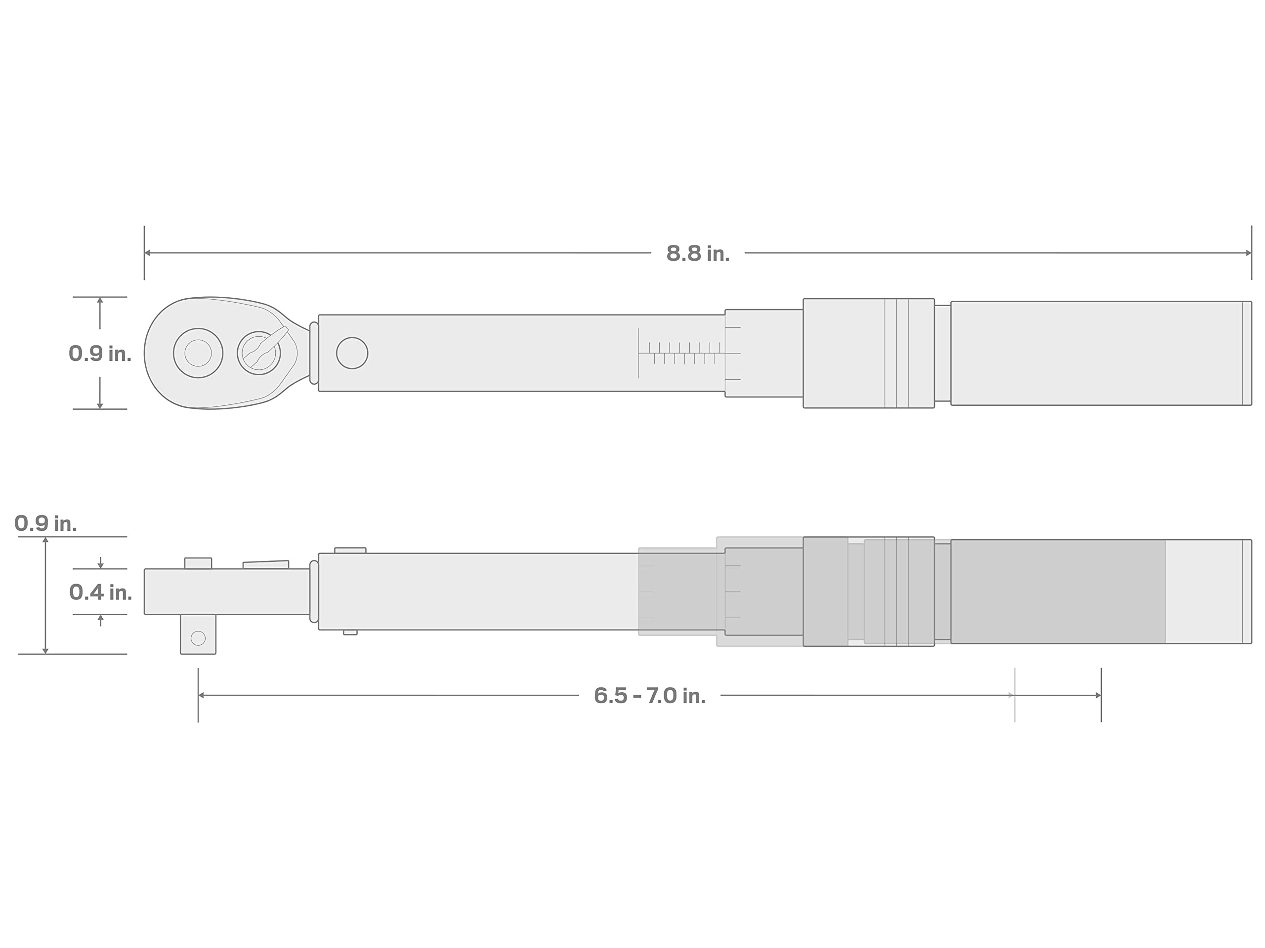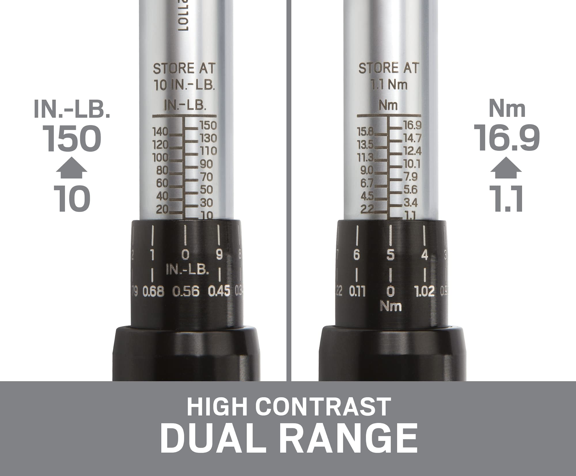 Specifications: Range – in.-lb.: 10-150 in.-lb. Range – Nm: 1.1-16.9 Nm Increment: 1 in.-lb. (0.113 Nm) Accuracy: ± 4 percent Length: 8-13/16 inch Ratchet: 72 tooth Country of Origin: Taiwan