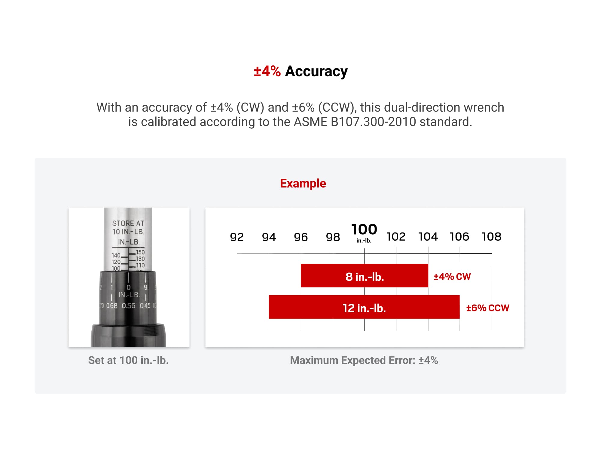 - Ships pre-calibrated to an accuracy of +/- 4% (clockwise) and +/- 6% (counterclockwise)