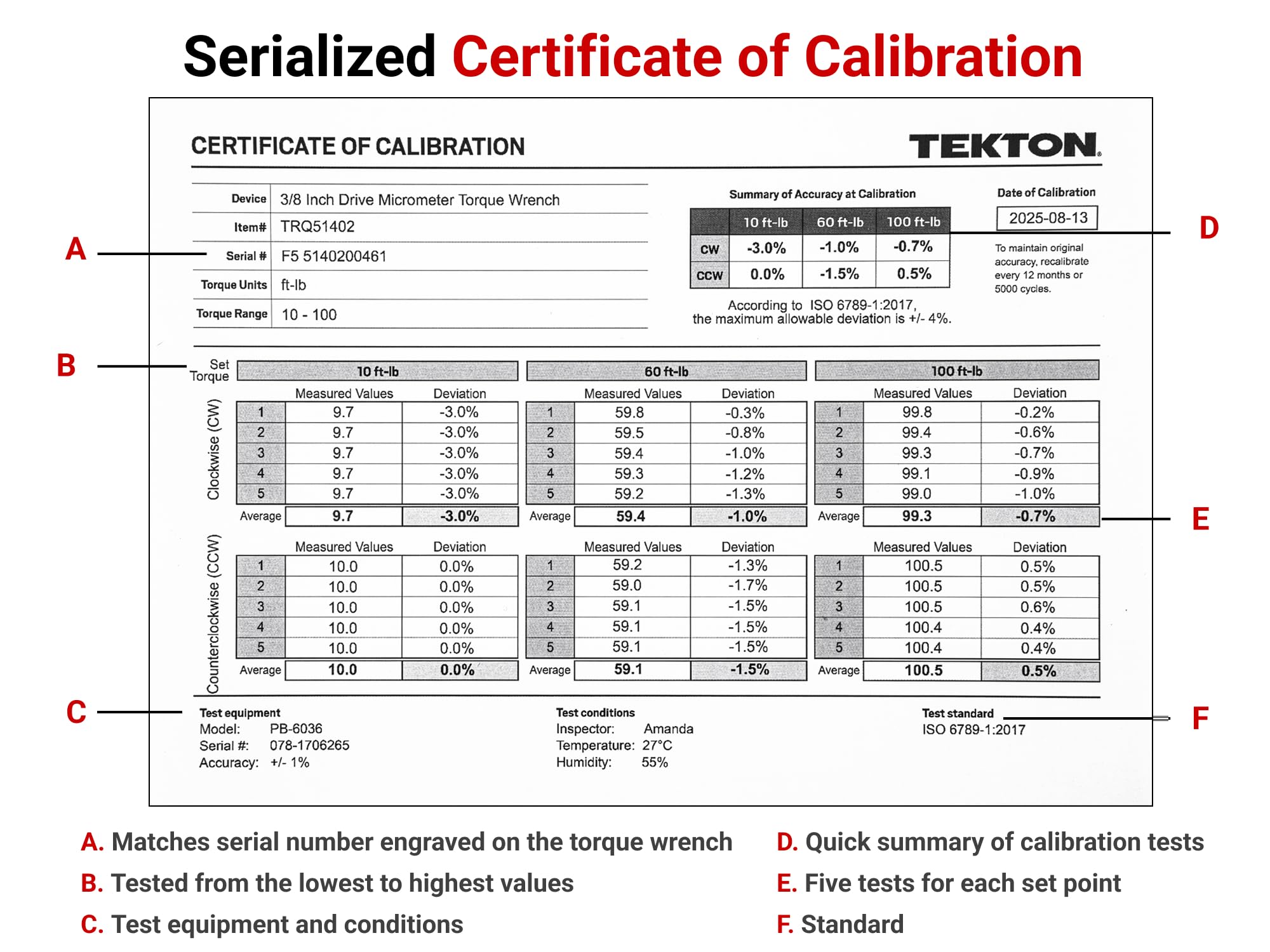 • Serialized Certificate of Calibration – Includes serial number, test results, and test equipment and conditions