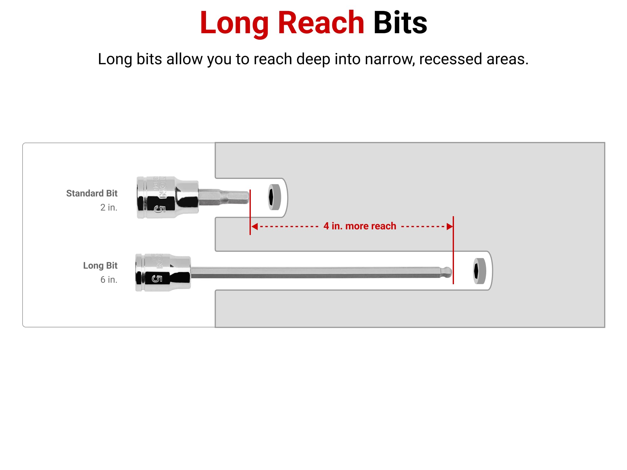 - Extra-long bits allow you to reach deep into especially narrow, recessed areas