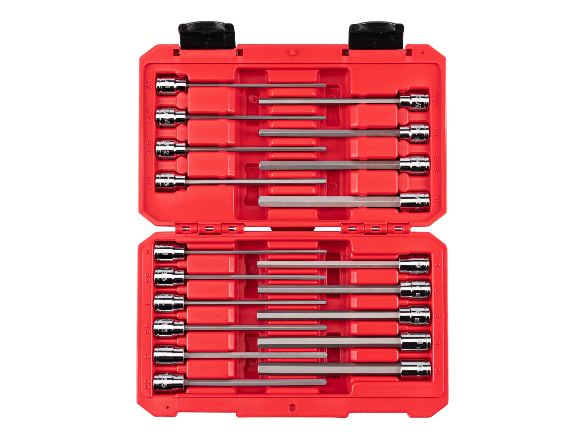 - Includes 8-pc 3/8 in. drive 6 in. long hex bit sockets: 1/8, 9/64, 5/32, 3/16, 7/32, 1/4, 5/16, 3/8 in.; 11-pc 3/8 in. drive 6 in. long hex bit sockets: 3, 3.5, 4, 4.5, 5, 5.5, 6, 7, 8, 9, 10 mm; Carrying case