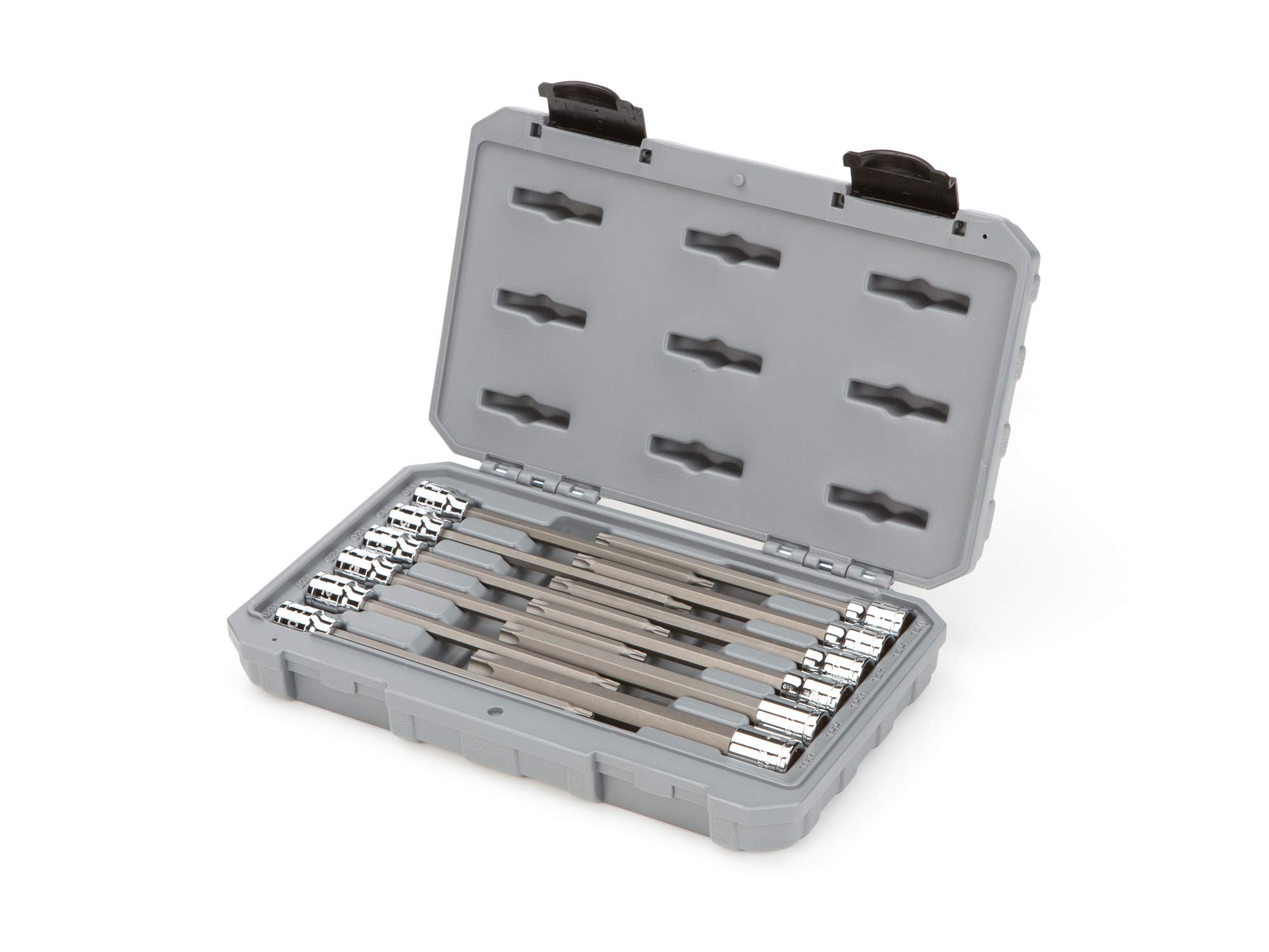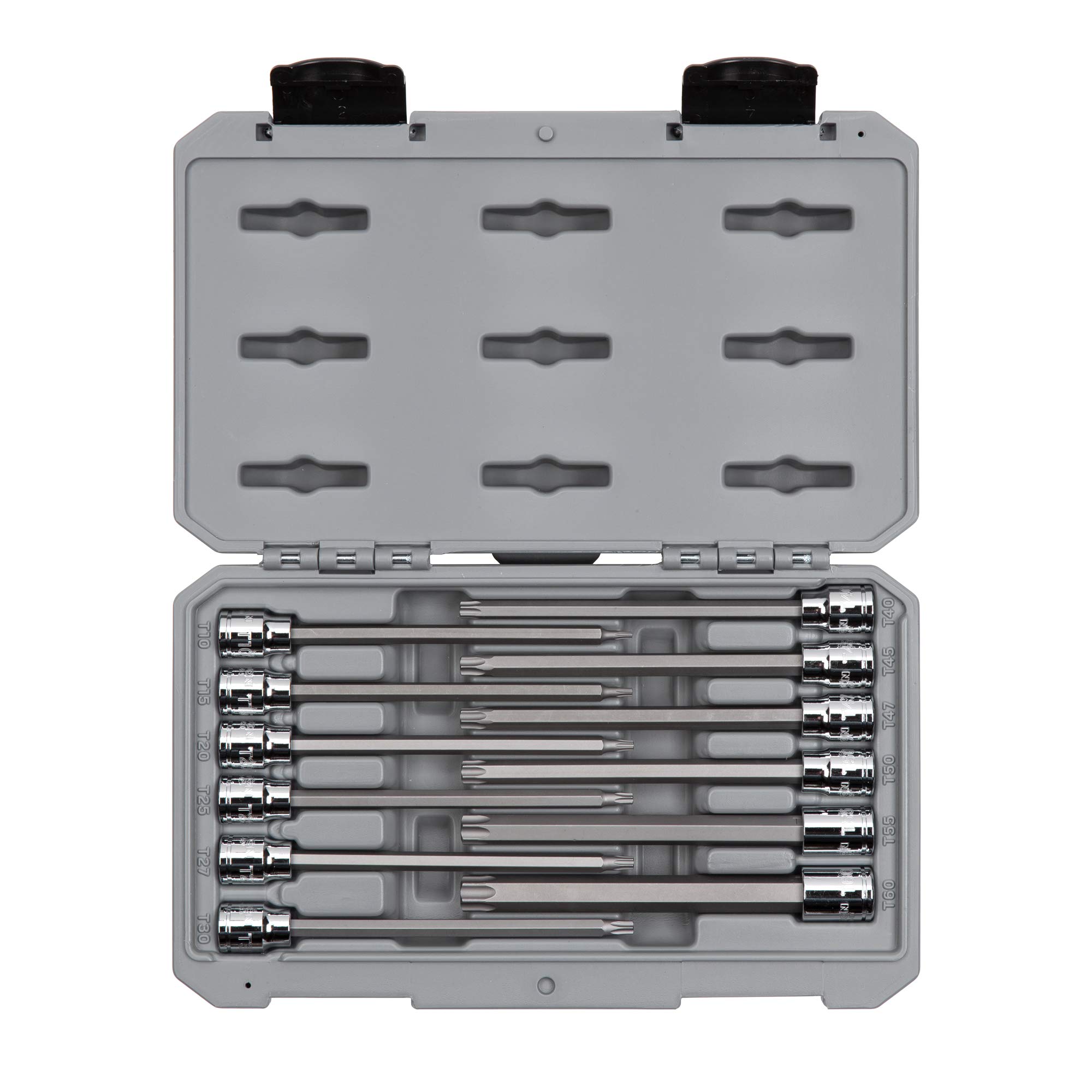 - Includes 12-pc. 3/8 in. drive long Torx bit sockets: T10, T15, T20, T25, T27, T30, T40, T45, T47, T50, T55, T60; Carrying case