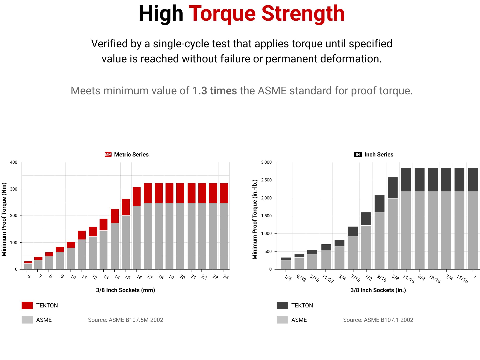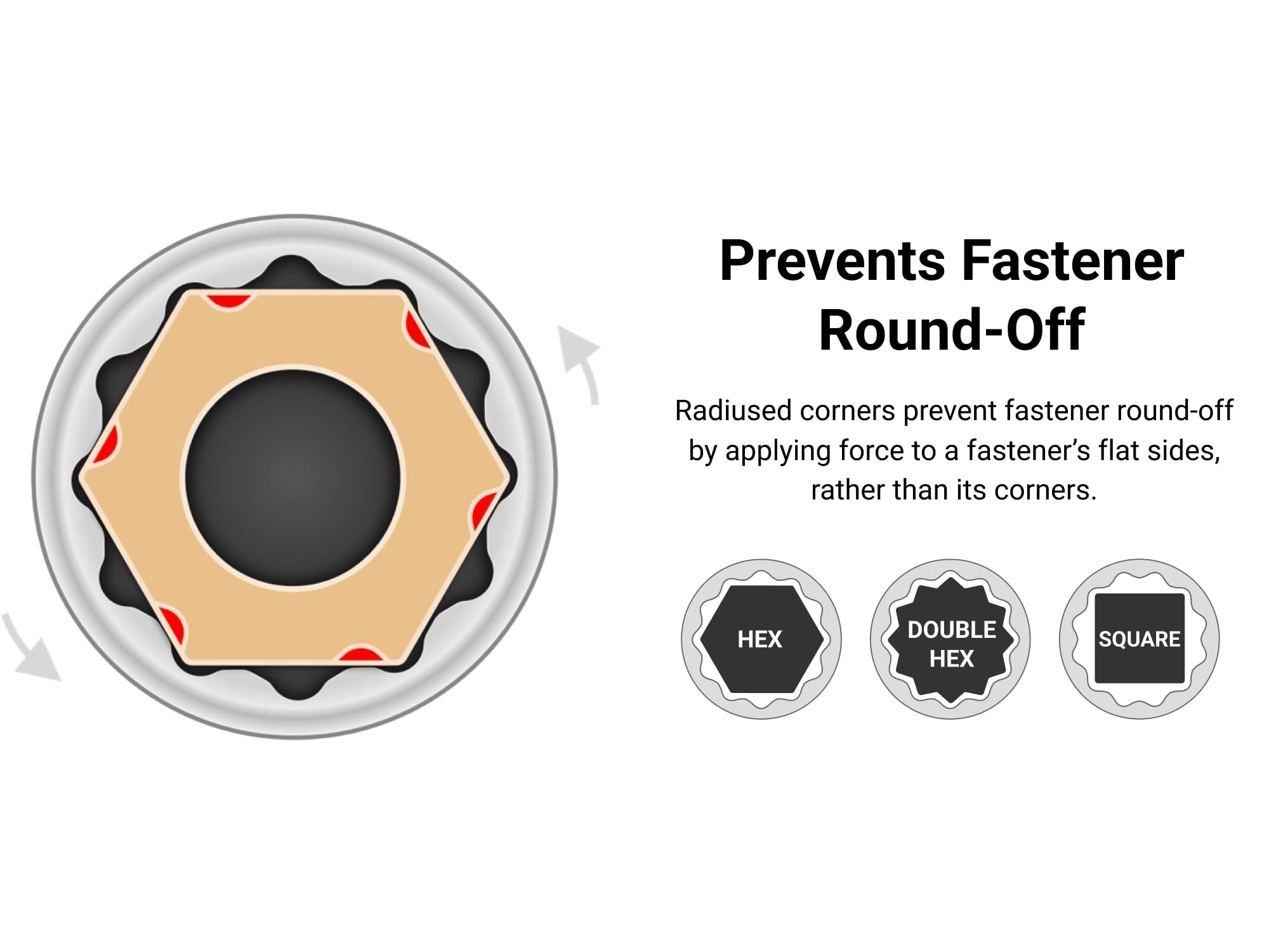 • Socket geometry is designed to apply force to flat sides of fasteners and not the corners, preventing round-off