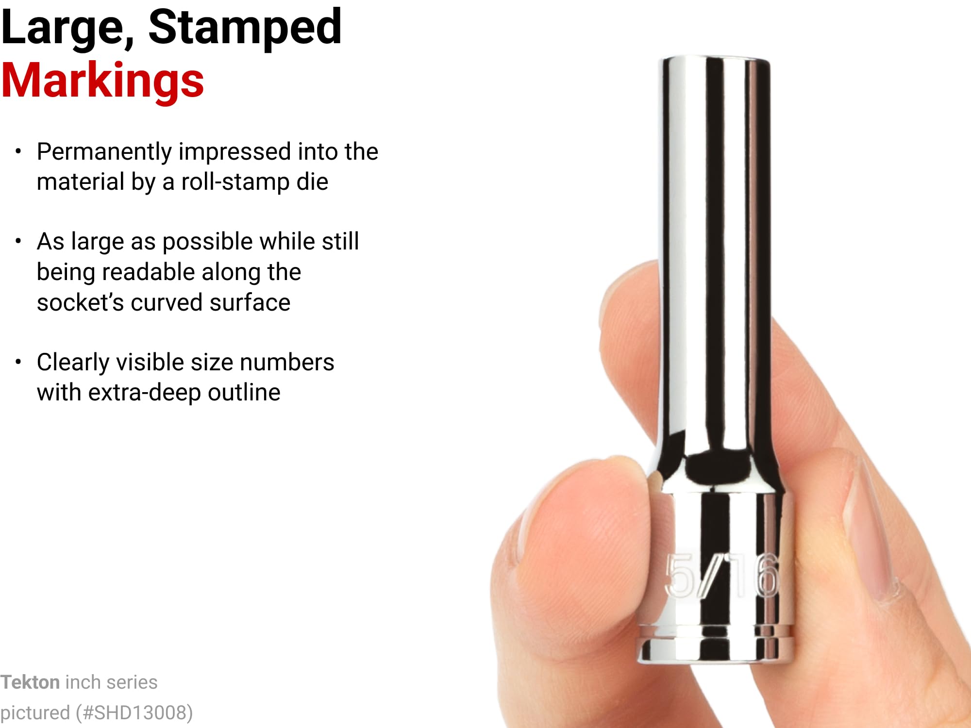 Details: Tekton shallow 12-point sockets are an exact fit for double hex fasteners and also work with hex and square shapes. They’re designed to grip the sides and not the corners of the fastener heads, which prevents round-off. Their extended length allows the deep socket to fit over long fasteners and reach into recessed areas. The large, die-stamped markings are permanently impressed into the material and optimized for readability.