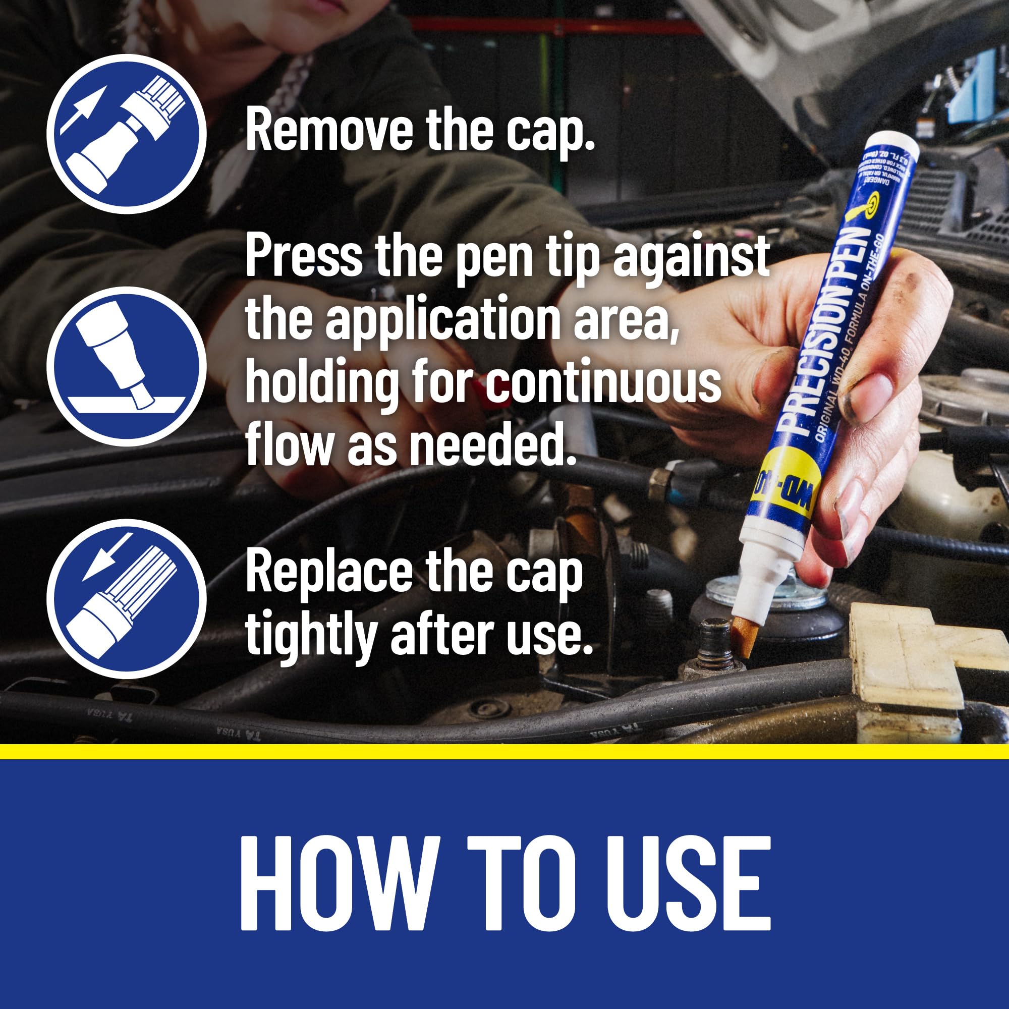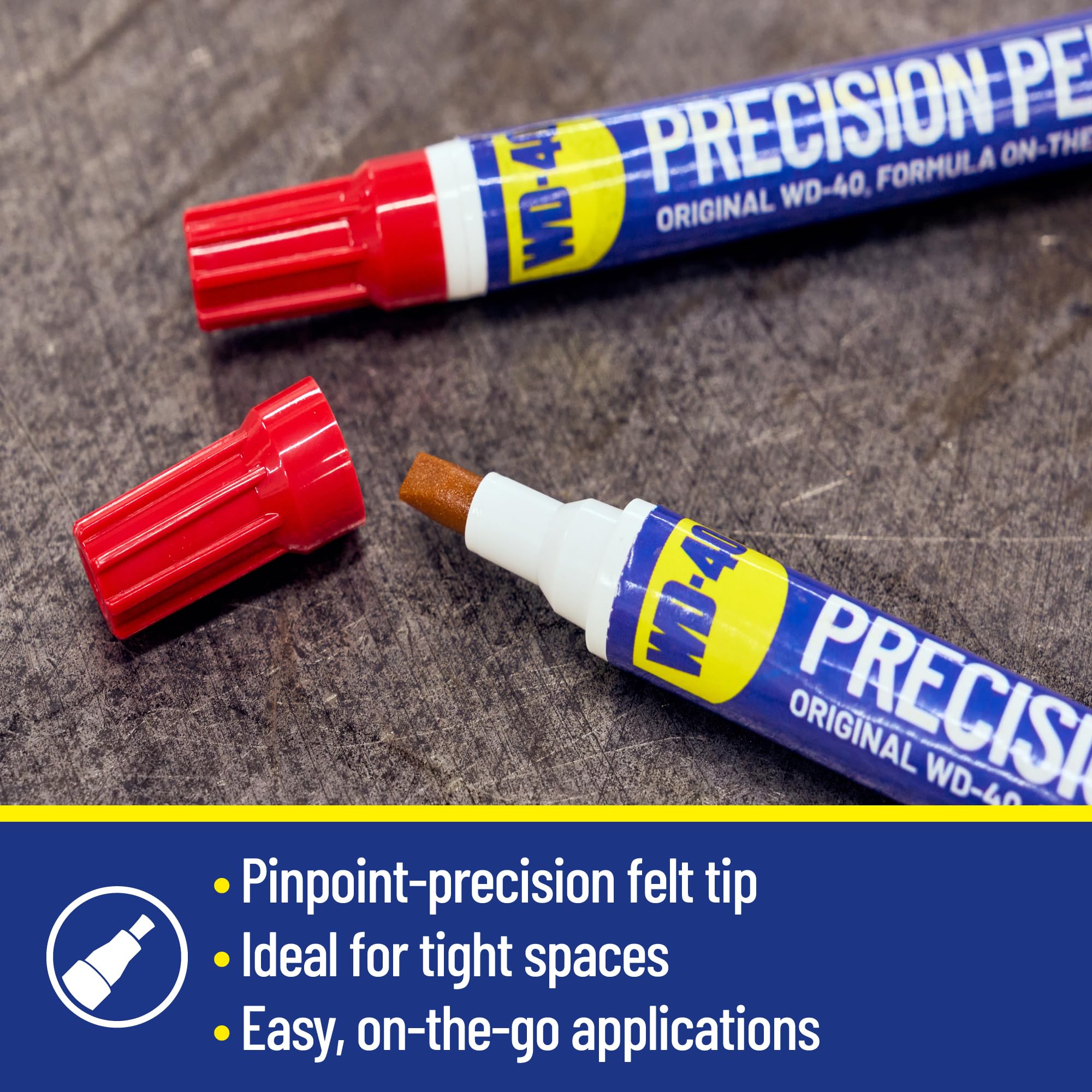 - PINPOINT PRECISION: The chisel-shaped, fibrous tip allows for precise application of Original WD-40 Formula exactly where it’s needed. The non-aerosol format keeps lubricant from getting on the parts that don’t need it. 2024 POPULAR MECHANICS GEAR OF THE YEAR WINNING PRODUCT