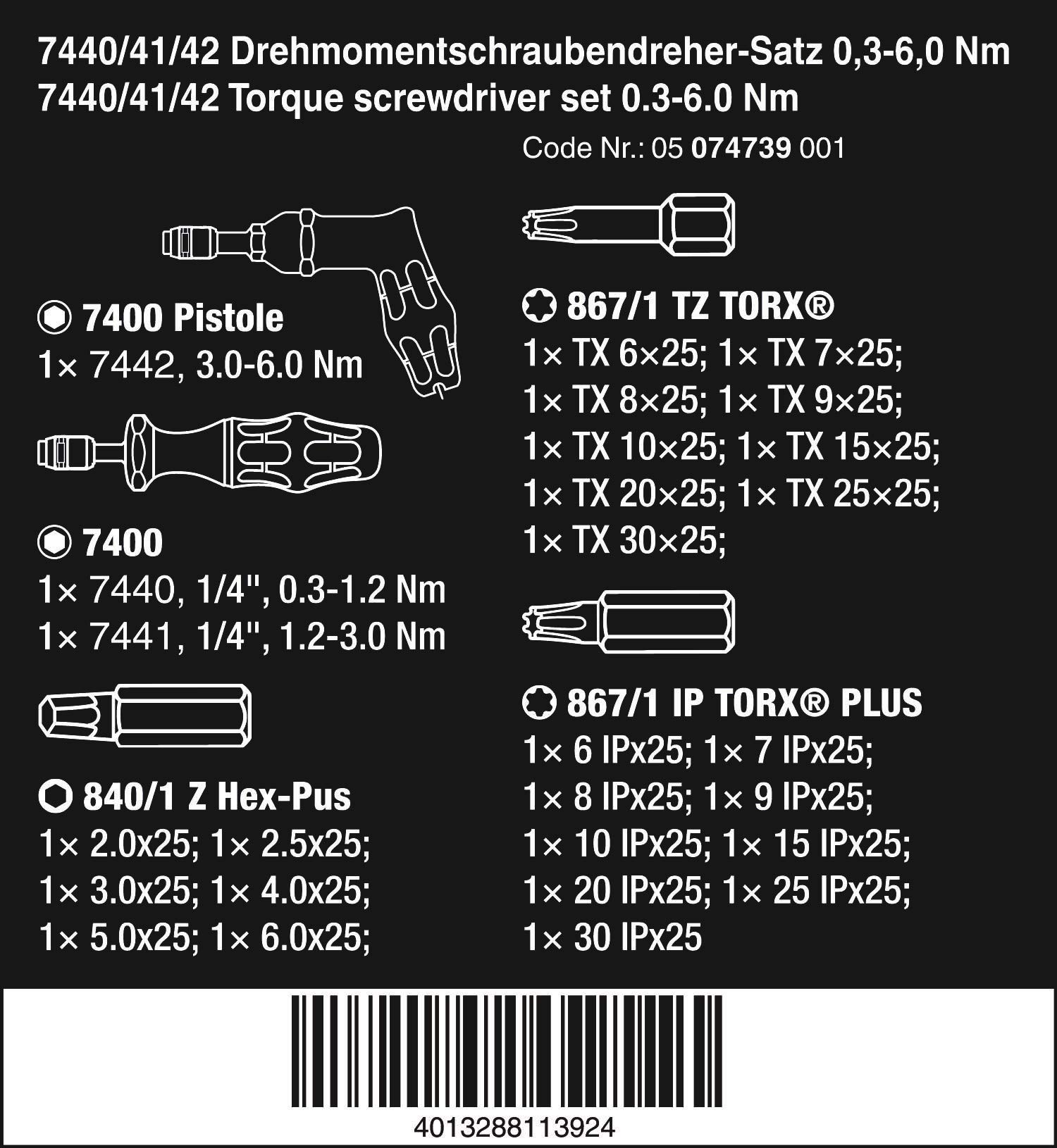 Wera Kraftform 27 Piece Adjustable Torque Screwdriver set is designed for torque controlled tightening to guarantee the safety of the screw connection. Torque can easily be set to the required scale value by hand without special tools. Measurement accuracy is +/- 6% in accordance with standard EN ISO 6789. Wera torque tools have unlimited loosening torque to loosen seized screws. All Wera hand tools feature the trademarked ergonomic Kraftform handle, with hard and soft zones, that fits the shape to the hand for the ultimate in comfort and high-speed torque transfer. Adjustable torque screwdrivers feature the Rapidaptor bitholder with quick-release chuck that allows for speedy one-handed bit insertion and removal for insert and power bits. Calibration certificate included. Limited Life Time Warranty. Set contains 1 x 7400 Adjustable Torque screwdriver with Rapidaptor, range 0.3-1.2 Nm, 1 x 7441 Adjustable Torque Screwdriver with Rapidaptor, range 1.2-3.0 Nm, 1 x 7442 Pistol Handle Adjustable Torque Screwdriver with Rapidaptor, range 3.0-6.0 Nm and 24 carbide insert bits, 6 Hex bits– 2mm, 2.5mm, 3mm, 4mm, 5mm, 6mm; 9 Torsion (TZ) TORX bits – TX6, TX7, TX8, TX9, TX10, TX15, TX20, TX25, TX30; 9 TORX PLUS bits – 6 IP, 7 IP, 8 IP, 9 IP, 10 IP, 15 IP, 20 IP, 25 IP, 30 IP. Includes durable storage case with molded insert. Wera – The Best Tools For The Job!