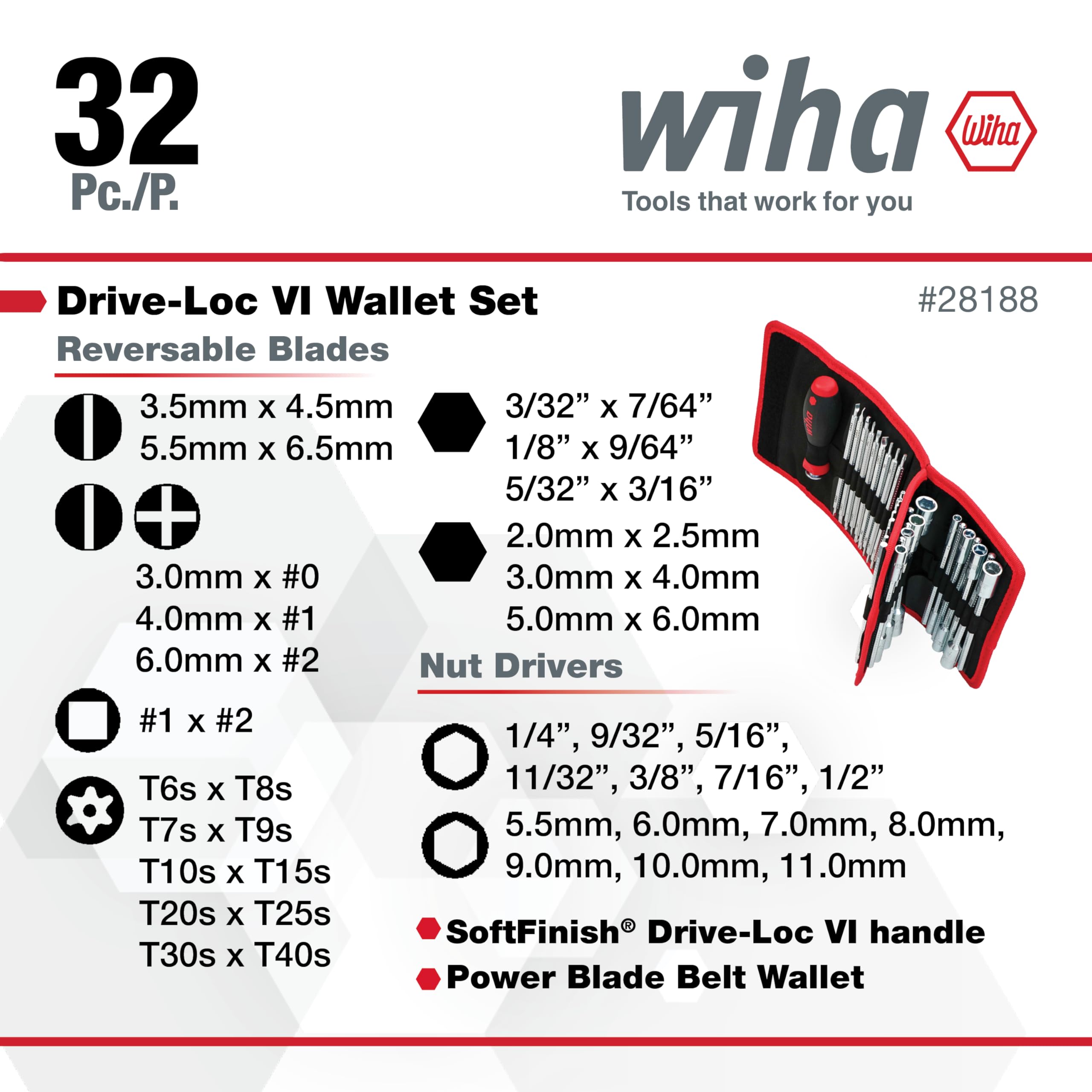 Wiha 28188 Drive-Loc VI Wallet Set, 32 Piece, Phillips, Slotted, Square, Torx, Hex & Nut Drivers, SoftFinish Handle